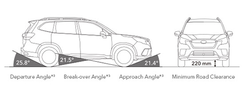 El Forester fue diseñado no solo para una gran distancia al suelo de SUV, sino también para considerar cuidadosamente los ángulos de aproximación, salida y ruptura. Todos han sido optimizados para ayudarte a superar obstáculos sin sufrir daños ni atascarse.