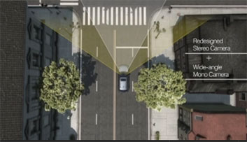 Una cámara monocular de gran angular adicional funciona con el sistema de doble cámara para mejorar la detección de peatones y bicicletas a baja velocidad.